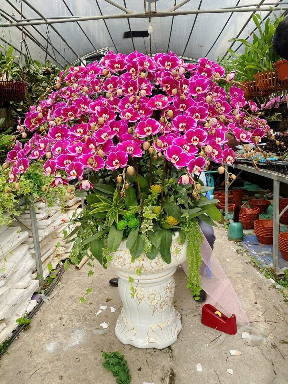 Chậu hoa lan hồ điệp Kim Tiền Thảo là một tác phẩm nghệ thuật được thiết kế tinh tế, sang trọng, mang đến vẻ đẹp rực rỡ và đẳng cấp cho không gian sống. Sắc tím huyền bí của lan hồ điệp kết hợp cùng hệ lá xanh mướt tạo nên bố cục đầy sức sống, tượng trưng cho tài lộc, may mắn và sự vững bền, rất phù hợp để trưng bày tại phòng khách, sảnh tiếp khách, văn phòng hoặc làm quà tặng cao cấp. Màu tím sang trọng, biểu tượng của sự thịnh vượng và quý phái. Kiểu dáng tầng rộng, hoa nở đồng đều, tạo hiệu ứng phô diễn mạnh mẽ và đầy cuốn hút. Hoa được tuyển chọn từ những cánh lan khỏe mạnh, cành dài, bông to, có độ bền màu và thời gian chơi hoa lâu. Phối cùng lá xanh bóng tạo tổng thể hài hòa, tươi mát. Chậu sứ cao cấp có họa tiết tinh xảo, tăng thêm vẻ đẹp sang trọng cho tổng thể sản phẩm. Chậu lan “Kim Tiền Thảo” mang năng lượng tích cực, thu hút vận khí tốt: Mang lại may mắn – bình an – tài lộc. Tượng trưng cho sự phú quý, viên mãn và sung túc. Rất thích hợp làm quà tặng khai trương, tân gia, lễ Tết hoặc gửi biếu đối tác, cấp trên. Phòng khách biệt thự, chung cư cao cấp Sảnh đón tiếp, khách sạn, văn phòng Sự kiện sang trọng, lễ chúc mừng Làm điểm nhấn nội thất, tôn lên vẻ đẹp hiện đại của không gianCHẬU HOA LAN HỒ ĐIỆP “KIM TIỀN THẢO” – ĐẲNG CẤP & THỊNH VƯỢNG